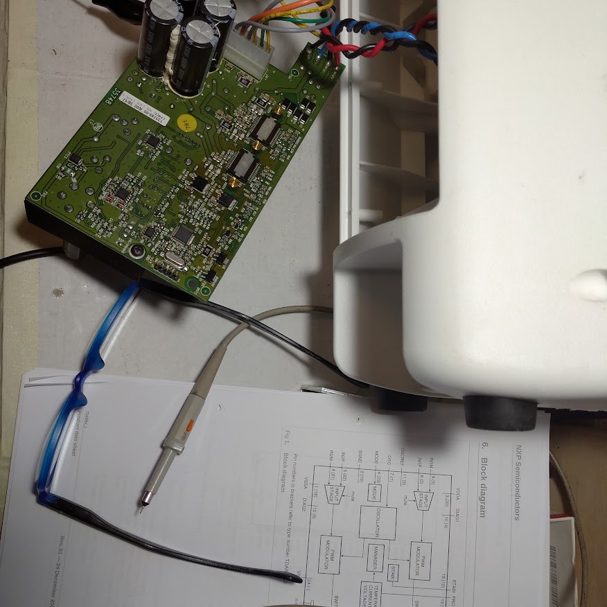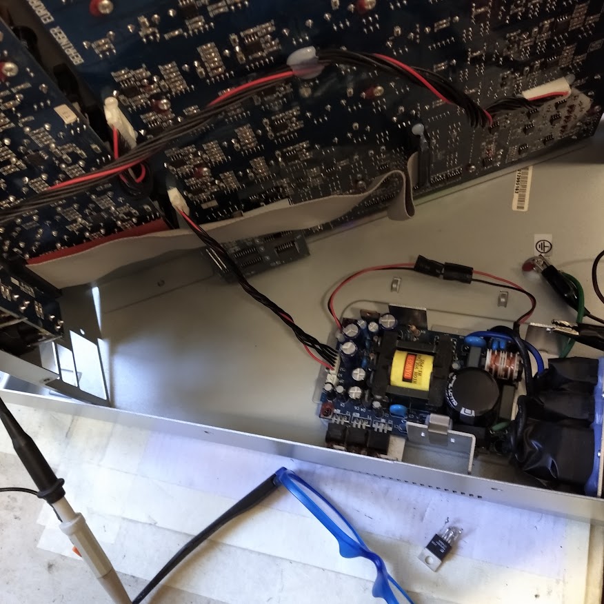 una vite di fissaggio della scheda di alimentazione e potenza, svitata dalle vibrazioni, ha causato un cortocircuito con il telaio metallico: sostituiti 2 doppi diodi BAV99 e 2 resistenze 100ohm nel circuito di feedback e protezione dell'alimentazione duale +/-80V smps