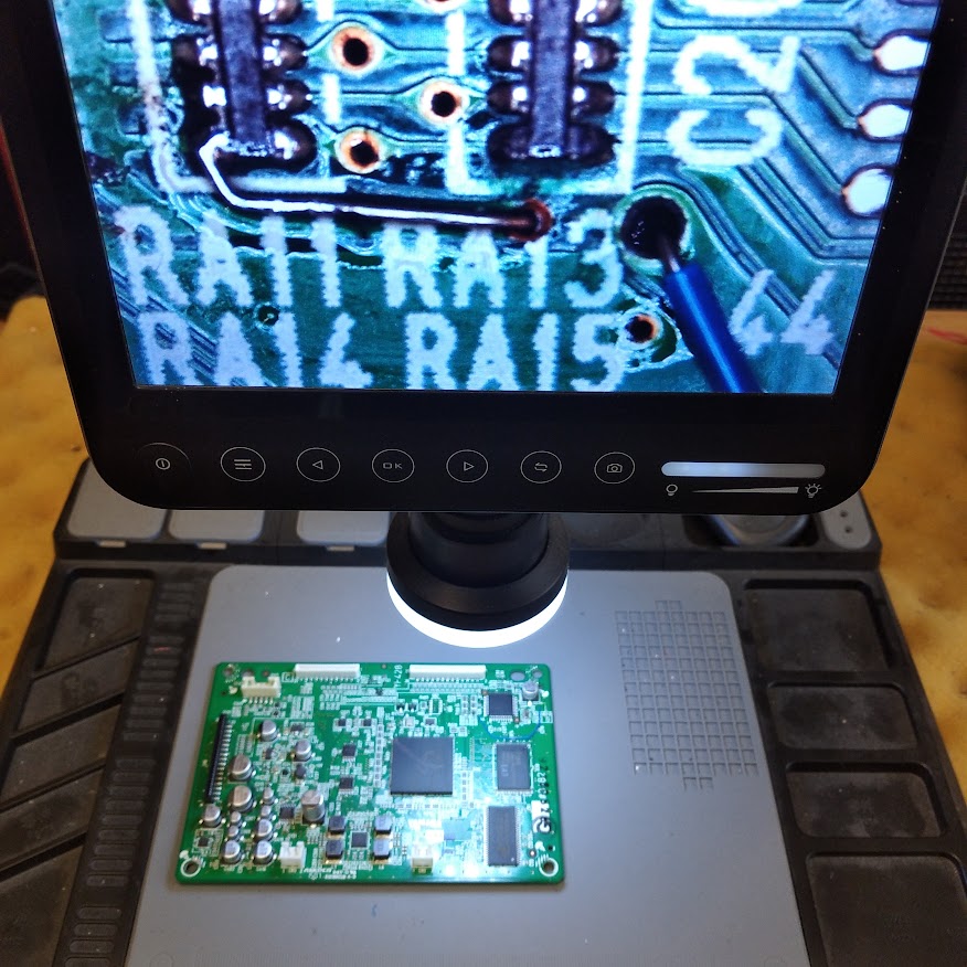 | connessione circuito stampato interrotta, ripristinata con microfilo |