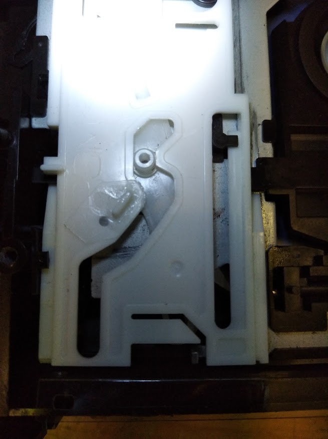 | EJECT non funzionante, la meccanica si blocca: riparato leveraggio di azionamento del braccio di espulsione del CD. |