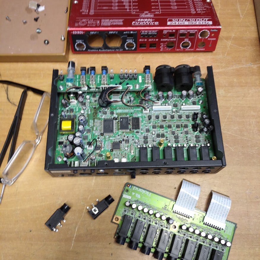 | sostituiti 2 connettori jack, ripristinate 5 connessioni danneggiate nel circuito stampato. |